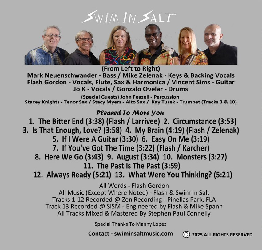 The NEW 'Swim in Salt' album 'Pleased To Move You' is available for purchase and streaming. ![]() ![]() 11.01.25: Video from our album release party. Our first album is also available. Contact Flash for details. |